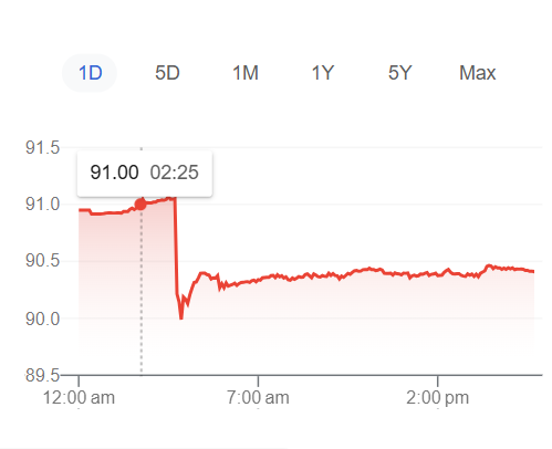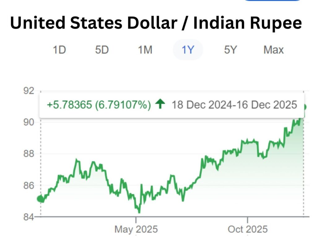17 दिसम्बर 2025 को 1 डाॅलर की कीमत करीब 2:25 PM पर 91 रुपये की कीमत के बराबर हो गया।